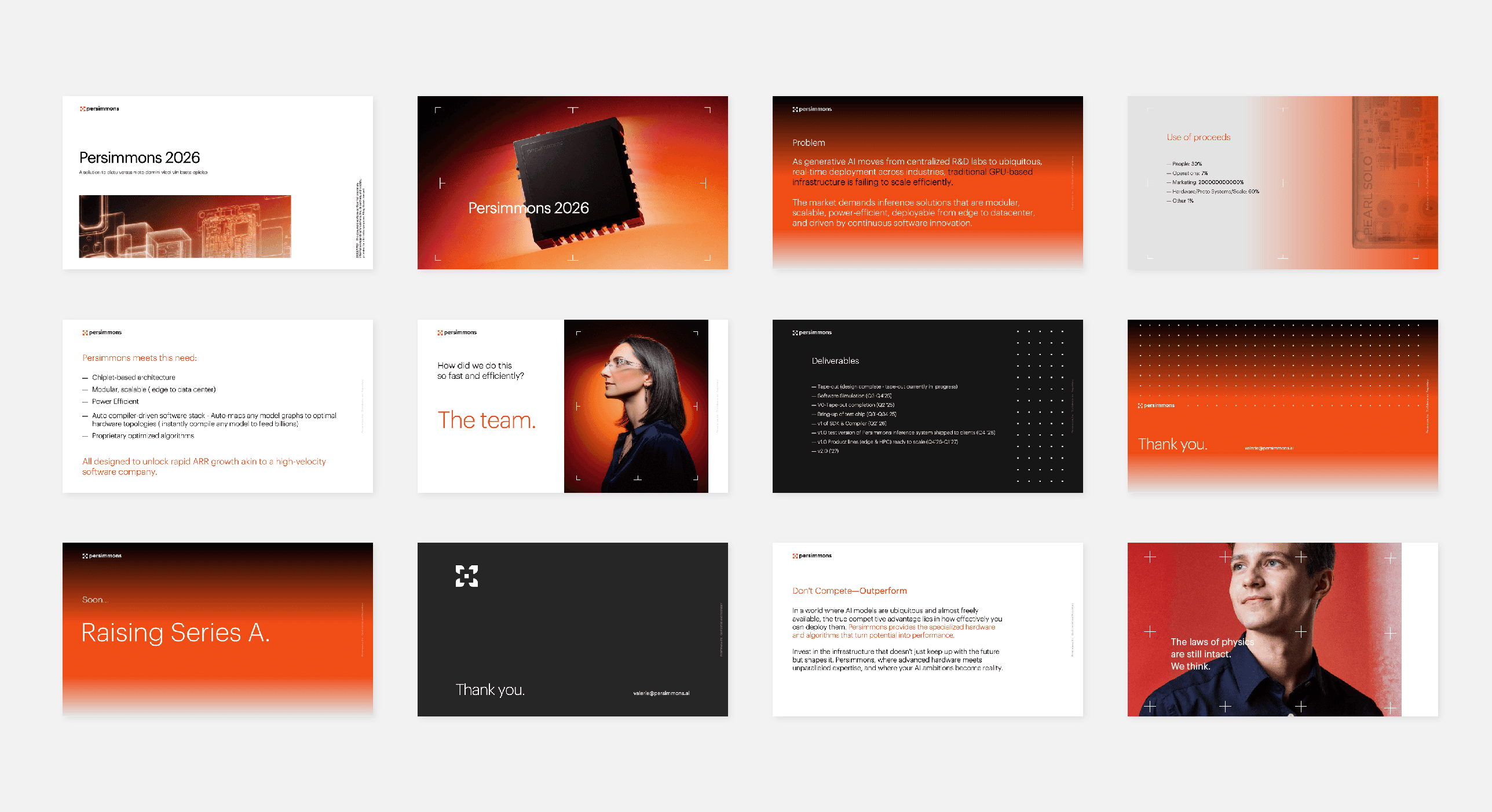 I led the mission to craft the brand from a blank page. Based on the idea that Persimmons is a physical chiplet, about 1cm square, the idea was that this single unit can scale to infinity. So the grid-based system was designed to scale in any space, across investor presentations, digital environments, photography, and product storytelling, ensuring the brand could grow alongside the technology itself.